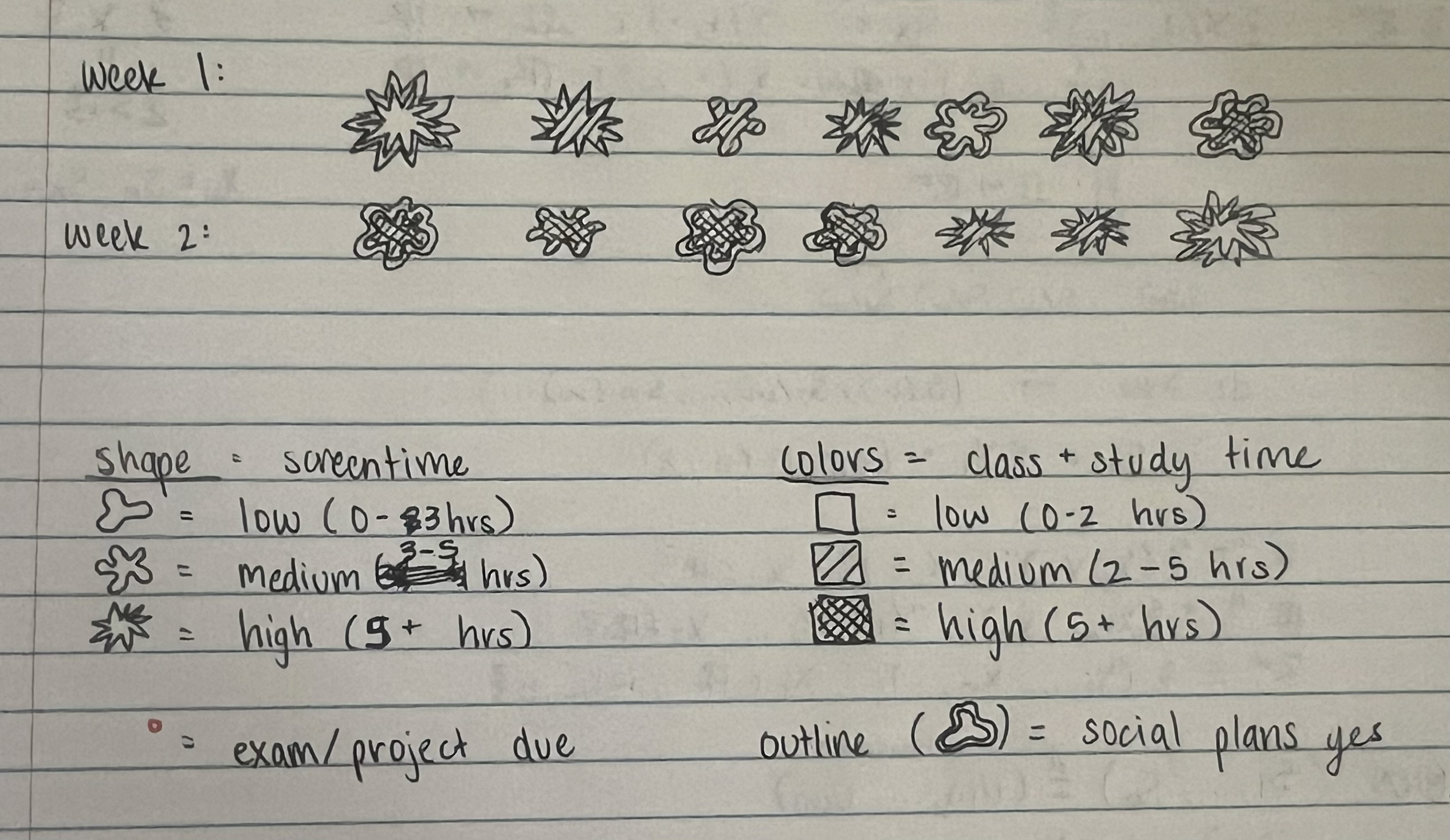 - Content This piece visualizes 32 days of my life from January 11 to February 28, tracking my screen time alongside class/study workload, sleep, social plans, and major academic deadlines. Each symbol represents one day in chronological order, allowing the viewer to see how different life factors overlap across time. Rather than focusing on one variable, the piece shows how busyness and screen time exist within a larger context of daily habits.
