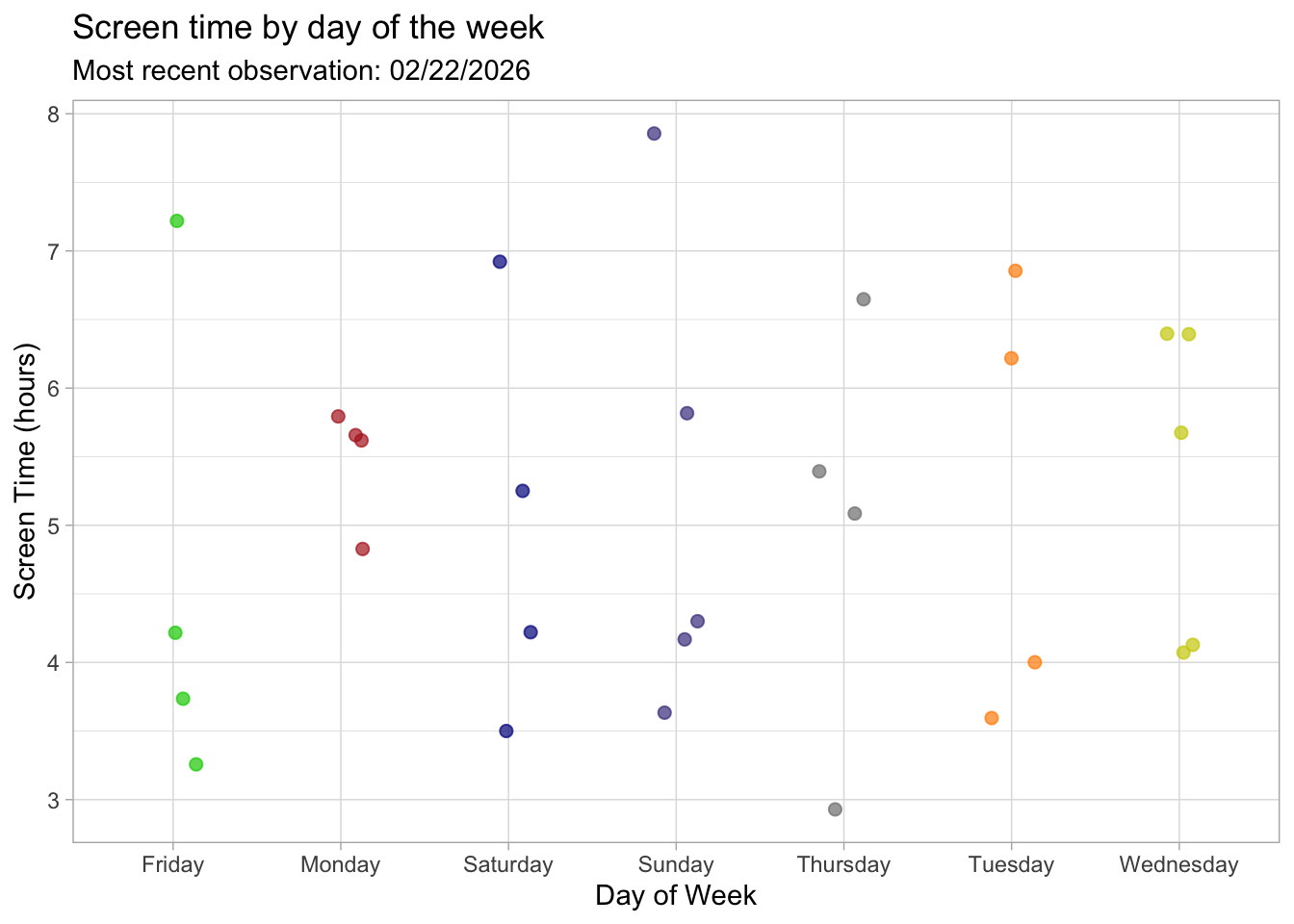 title = "Screen time by day of the week", #title summarizing main message,