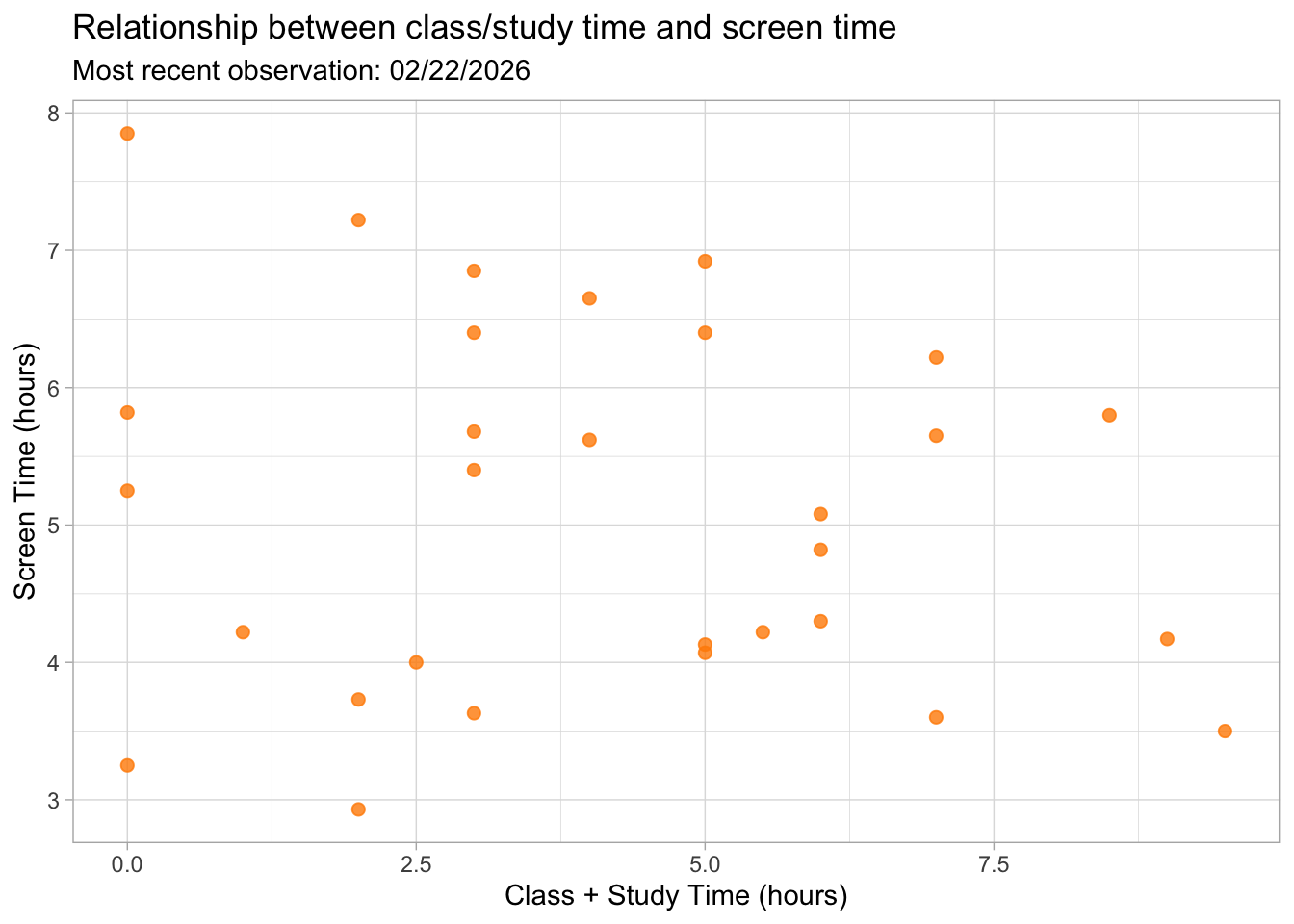 Figure 2. Relationship between class/study time (hours) and screen time (hours). Each point represents one day of observations. The scatterplot shows how screen time varies across different amounts of class and study time, with no strong pattern immediately visible.
