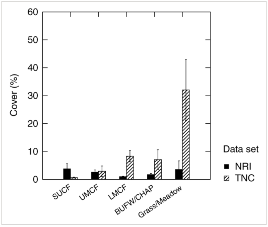 The figure displays vegetation formations on the x-axis and percent cover of non-native species on the y-axis, which is a sensible orientation because it compares invasion levels across categorical habitat types. The use of side-by-side bars allows clear comparison between the two datasets (NRI shown as solid black bars and TNC shown as hatched bars), and the error bars provide information about variability around the means. However, because the figure only shows summary statistics (bar heights and error bars) and does not display individual data points, it is difficult to assess the spread or overlap of observations within each vegetation type.Overall, the visualization effectively communicates the main statistical comparison, but additional detail would improve transparency.