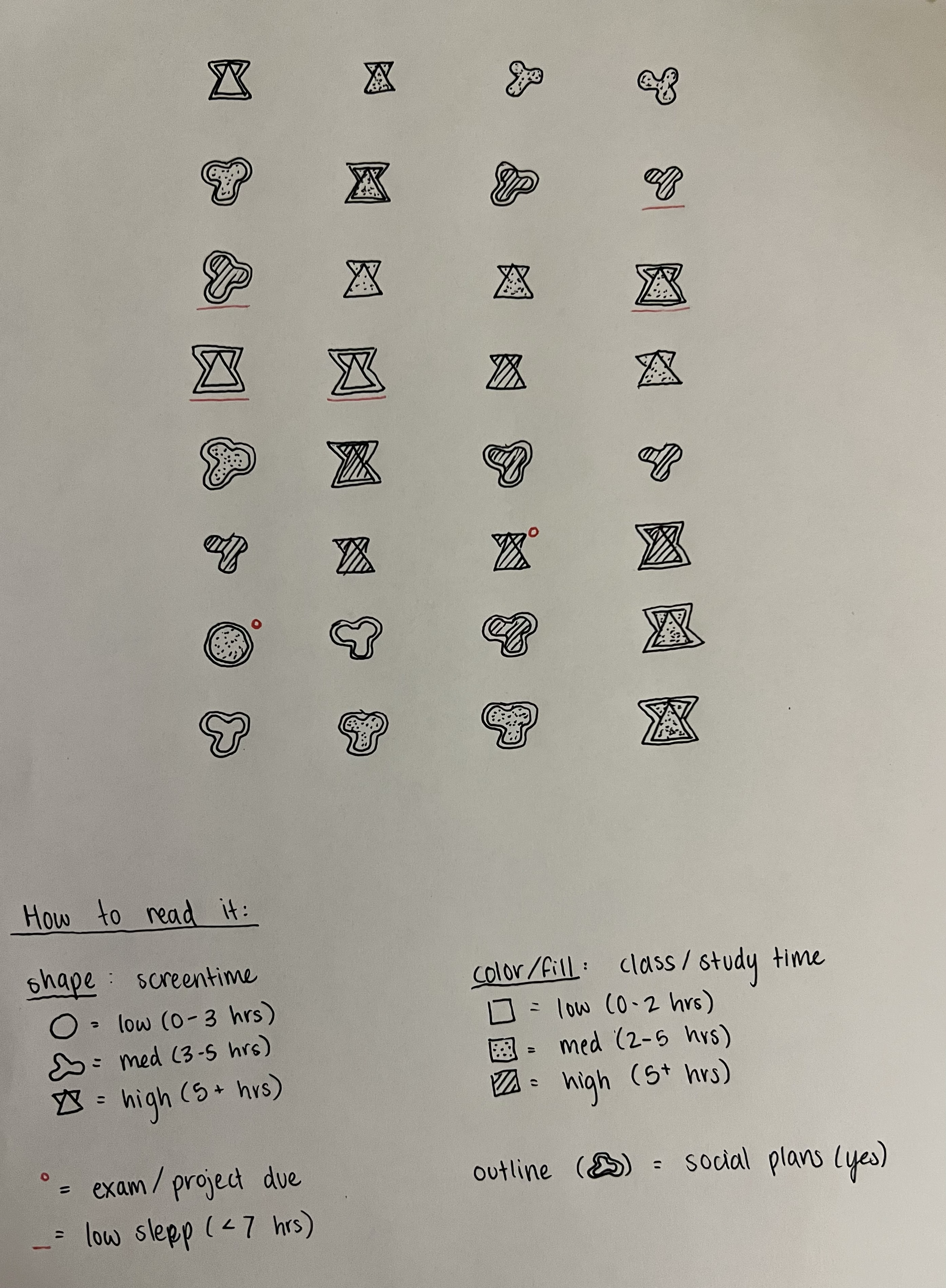 Alongside the code-based plots, I created a hand-drawn affective visualization to represent the same dataset in a more symbolic and personal way. The project was inspired by Giorgia Lupi and Stefanie Posavec’s Week of Goodbyes, which uses hand-drawn marks to encode personal experiences. Rather than focusing only on statistical relationships, this piece emphasizes how daily habits feel when viewed together over time.