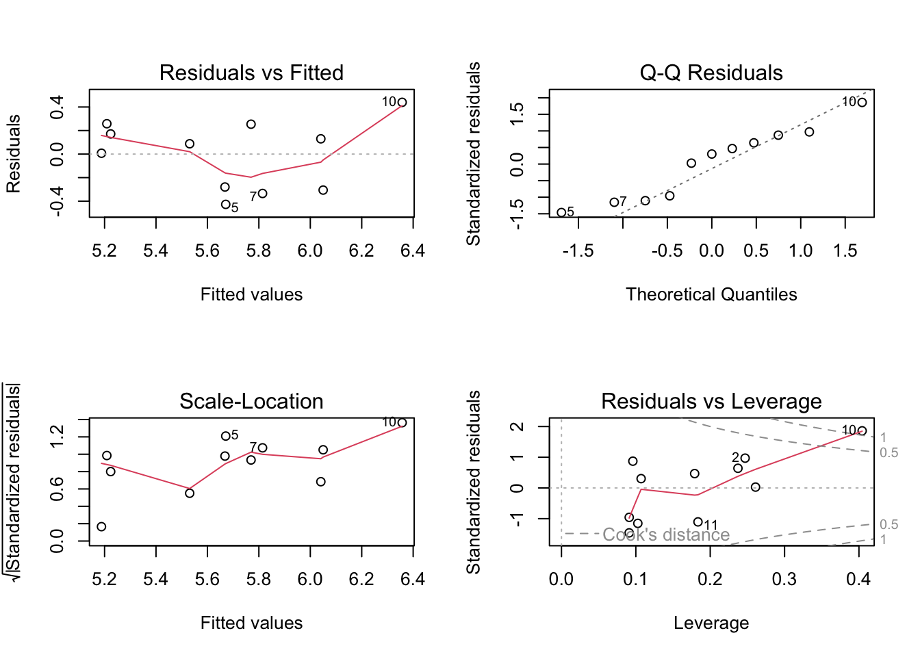 Personal notes: Residuals seem homoscedastic (consistent across values) based on Residuals vs Fitted and Scale-Location plots. Residuals also seem normally distributed based on QQ plot. No major outliers based on Residuals vs. Leverage plot