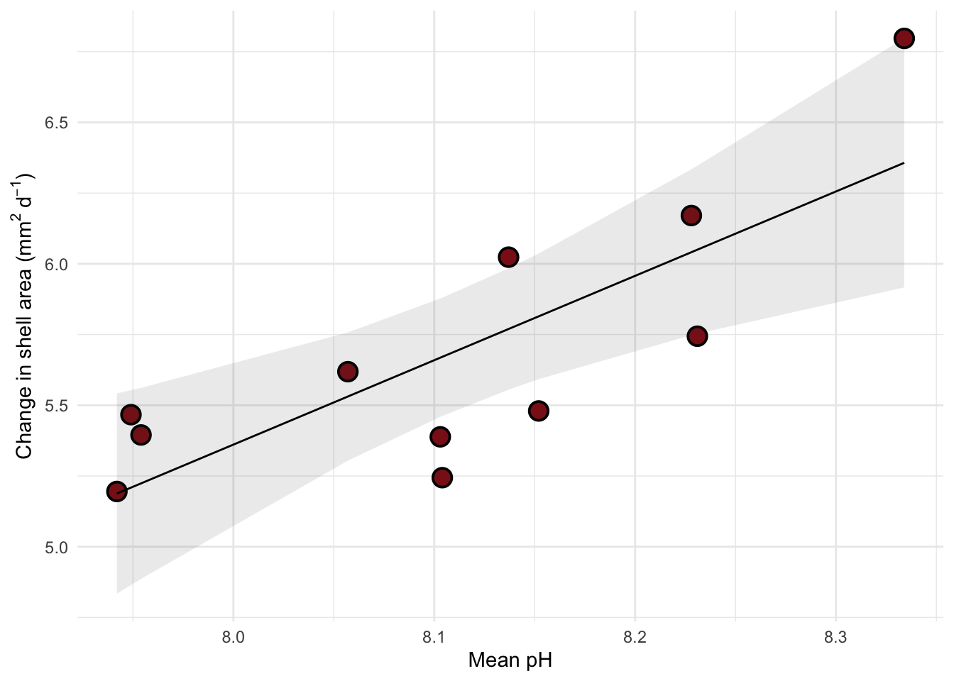 change_in_area ~ mean_ph, # formula: change in shell surface area per day as a function of pH